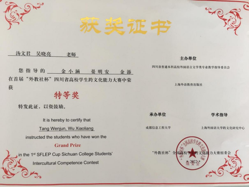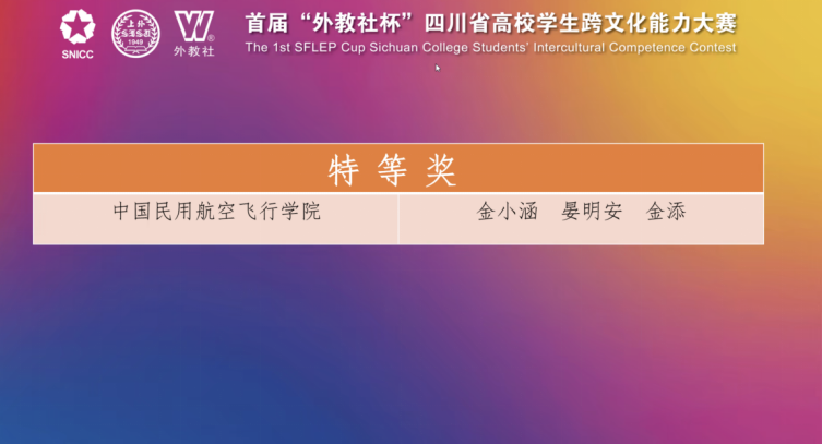 在稍早进行的首届“外教社杯”四川省高校大学生跨文化能力大赛中,金小涵所在团队从全省28所院校的87名选手中突出重围,以团队第一名身份斩获四川赛区特等奖,并获得代表四川赛区参加全国决赛资格。