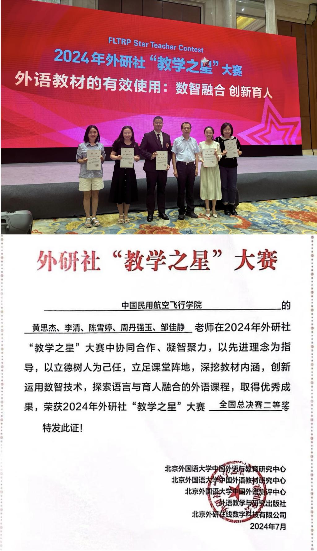 7月28日,2024年外研社“教学之星”暑期大学英语组教学比赛在安徽合肥圆满落幕,我校sjb世俱杯官方网站教师黄思杰、李清(团队成员陈雪婷、周丹强玉、邹佳静)凭借出彩的课程设计、扎实的语言功底荣获2024年外研社“教学之星”全国总决赛二等奖的优异成绩,为本次四川省大学英语组晋级高校所获得的最佳名次。