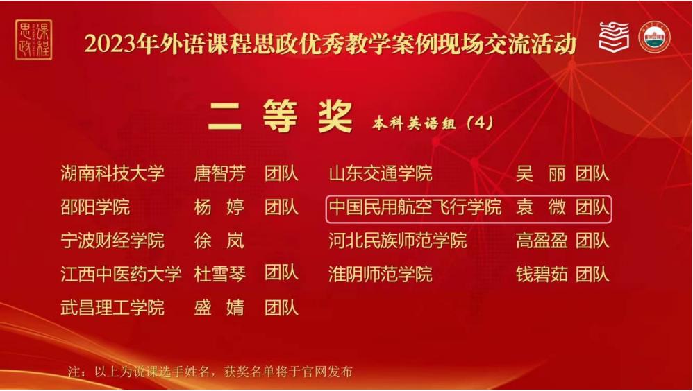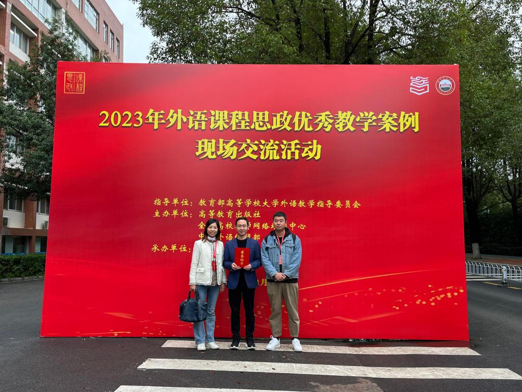 由国际合作部袁微副教授和sjb世俱杯官方网站叶家春副教授、黄思杰老师组成的团队以此项赛事四川省英语专业组特等奖身份入围全国交流活动。此次活动赛制为随机抽取文本材料,参赛教师经过90分钟的现场准备,基于指定素材对课程思政教学设计进行说课展示,然后回答评委提问。现场赛制对于教师的教学基本功、临场应变能力和文本思政元素提炼能力都是极大的挑战。经过激烈角逐,团队最终斩获全国二等奖。