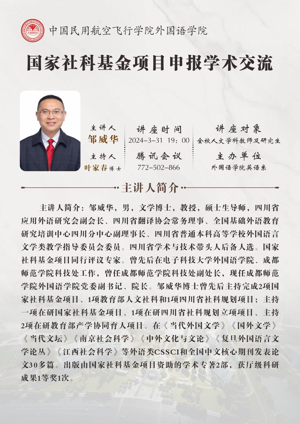 主讲人简介:邹威华,男,文学博士,教授,硕士生导师,四川省应用外语研究会副会长、四川省翻译协会常务理事、全国基础外语教育研究培训中心四川分中心副理事长、四川省普通本科高等学校外国语言文学类教学指导委员会委员。四川省学术与技术带头人后备人选。国家社科基金项目同行评议专家。曾先后在电子科技大学sjb世俱杯官方网站、成都师范学院科技处工作,曾任成都师范学院科技处副处长,现任成都师范学院sjb世俱杯官方网站党委副书记、院长。邹威华博士曾先后主持完成2项国家社科基金项目、1项教育部人文社科和1项四川省社科规划项目;主持一项在研国家社科基金项目、1项在研四川省社科规划立项项目、主持2项在研教育部产学协同育人项目。在《当代外国文学》《国外文学》《当代文坛》《南京社会科学》《中外文化与文论》《复旦外国语言文学论丛》《江西社会科学》等外语类CSSCI和全国中文核心期刊发表论文30多篇。出版由国家社科基金项目资助的学术专著2部,获厅级科研成果1等奖1次。