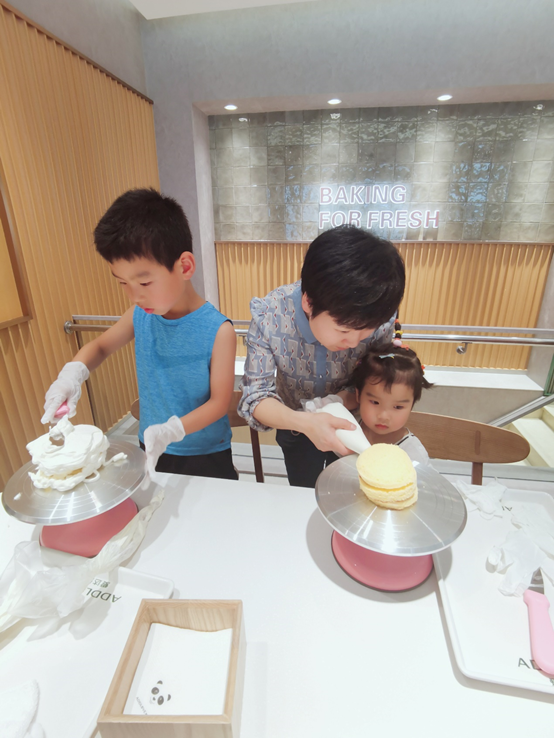 活动中,烘焙师首先为大家讲解了蛋糕制作的所需材料和基本操作流程,分享了蛋糕种类、奶油选择、储存等相关知识,紧接着,蛋糕DIY正式开始!老师们和孩子们在烘焙师的指导下,亲身体验,热情高涨,气氛热烈,活动现场弥漫着诱人的奶油香气。可口的水果、醇香的巧克力、五彩的糖果,加上阵阵的欢声笑语,气氛十分温馨。大家拿起抹刀,将一层层的奶油涂抹均匀地涂抹在海绵蛋糕胚上,在活动中体会着自己动手制作美食的快乐,享受着欢乐的烘焙时光,个个脸上洋溢着灿烂的笑容,在烘焙中感受幸福的味道。