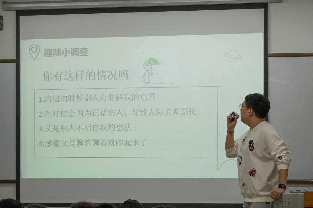 为引导大一新生关注自我精神健康,提高心理健康意识,2023年10月11日晚,sjb世俱杯官方网站特邀心理测评中心的张书宇老师面向2023级新生在5教416开展主题为“人际沟通——非暴力沟通”的讲座活动,帮助新生树立正确的精神健康观念,促进身心健康协调统一。本次活动由23级辅导员曾楠葳主持。