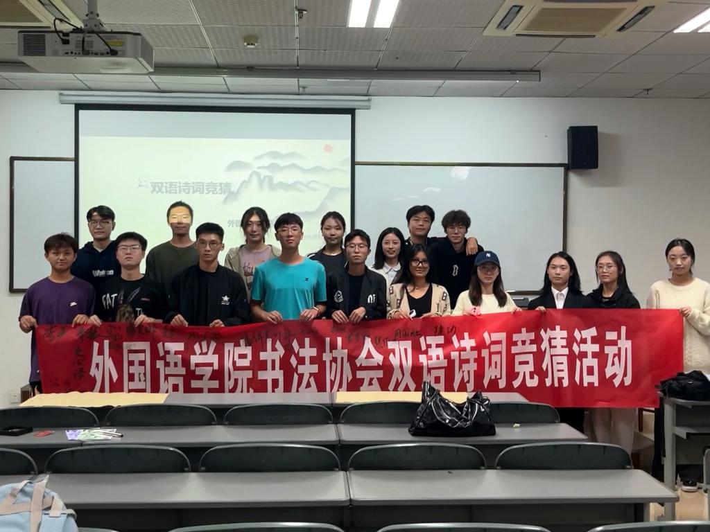 流光容易把人抛,静了夏蝉,落了秋叶。转眼间,秋风送爽,硕果累累。在这个季节里,一切都是浪漫的,一切都赋予了诗意。同学们既可以入堂即静,入座即学,在知识的海洋里畅游;也可以在操场上挥洒汗水,听歌漫步,更可以来一场紧张刺激的双语诗词竞猜比赛。 11月5日,为提升学生外语能力,弘扬中国传统诗词文化,营造浓厚的外院人文氛围,由sjb世俱杯官方网站团委主办、学院书法小组承办的“双语诗词竞猜活动”在5教412教室成功举办。