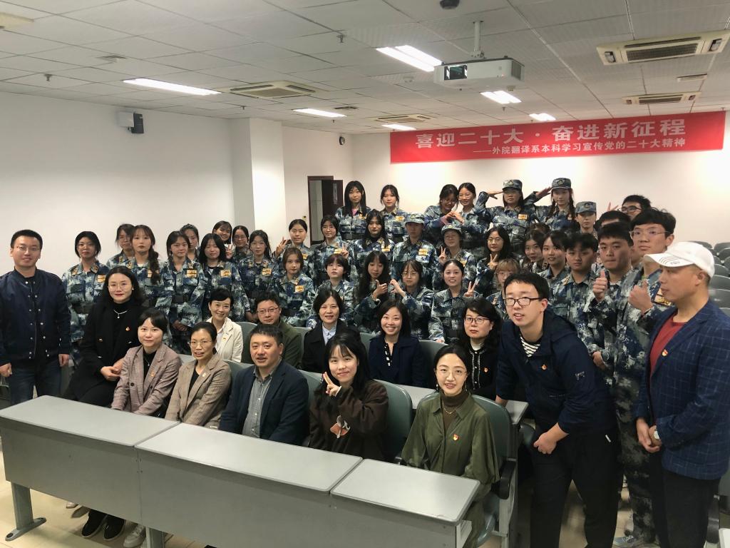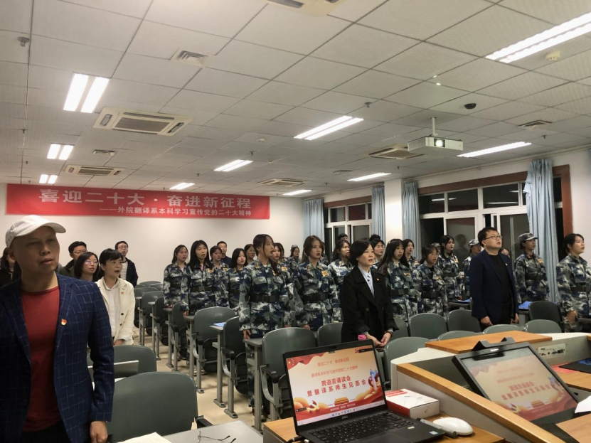 10月25日晚7点,“喜迎二十大•奋进新征程”——外院翻译系本科学习宣传党的二十大精神跨语言诵读会暨翻译系师生见面会在5教415教室召开。sjb世俱杯官方网站院长肖凌、党委副书记段震、副院长郑丽、翻译系主任刘武、吕兆芳博士、翻译系全体教师和翻译系22级全体学生参会,本次活动由翻译系党支部、翻译系主办,本科生党支部承办。