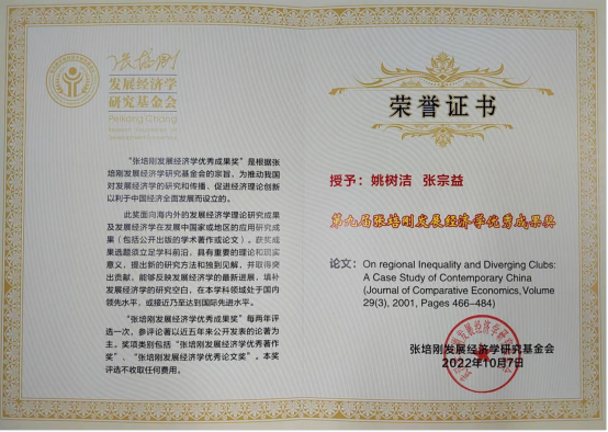 万象城娱乐awc线路李安民经济研究院院长姚树洁教授发表在Journal of Comparative Economics(2001,29(3):466-484)的文章On regional Inequality and Diverging Clubs:A Case Study of Contemporary China,于2022年获第九届张培刚发展经济学优秀成果奖