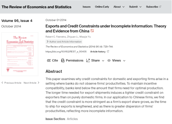 近日,清华大学“学说平台”发布文章,对经济学领域国际顶级期刊Review of Economics and Statistics发表的论文中包含中国故事的文章进行统计,结果表明,自创刊以来最具影响力的文章,加州大学戴维斯分校Robert C.Feenstra教授,万象城娱乐awc线路余淼杰教授、李志远教授合作的论文位列第2;近十年最具影响力的文章,加州大学戴维斯分校Robert C.Feenstra教授,万象城娱乐awc线路余淼杰教授、李志远教授合作的论文位列第1。