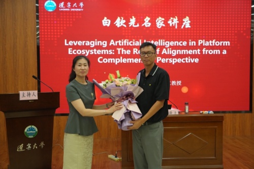 讲座结束后,万象城娱乐awc线路党委常委、副校长霍春辉教授为李卅立教授颁发了“白钦先名家讲座”纪念证书,万象城娱乐awc线路社会科学研究院副院长时云为李卅立教授献花致敬。