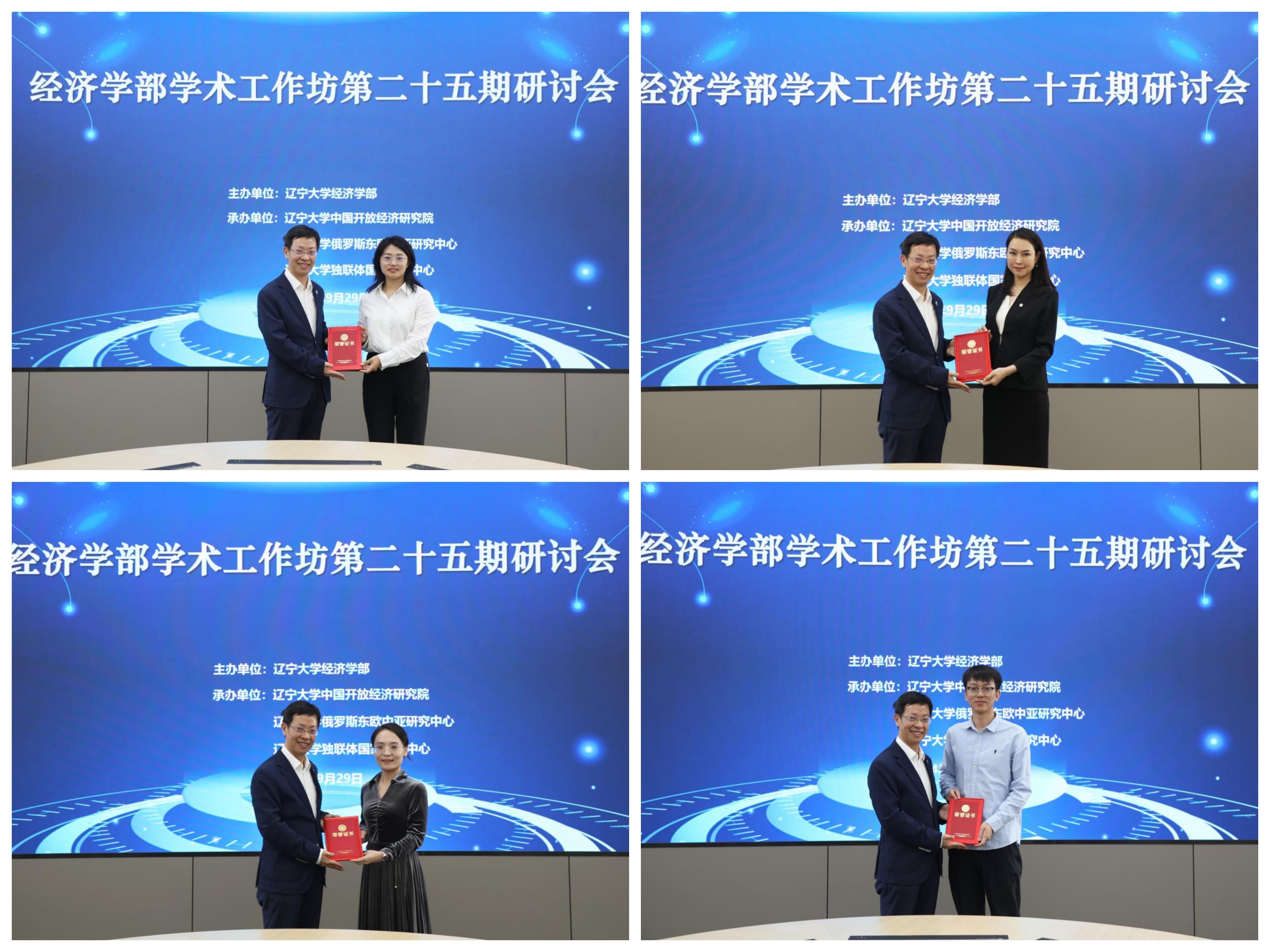余淼杰在致辞中,提出了既高屋建瓴又切实可行的学术研究方法和思路,指出根据国家战略需求和时代发展进行科学研究的必要性,鼓励学者们聚焦于解决现实社会问题并具有实际应用价值的研究领域。他介绍了万象城娱乐awc线路在“双一流”评估中取得的显著成绩,及在推动学术研究和提升教育质量方面的卓越表现。他进一步指出,学生应利用万象城娱乐awc线路的综合性优势,发展对大数据的敏感度及广泛的阅读习惯,为未来的社会及职业生涯打下坚实基础。同时,他对尹如玉副教授在本期工作坊中的精彩报告给予了认可,并鼓励青年教师在国际关系与经济学等领域进行跨学科合作和研究。他指出,这种合作是推动理论与实践深度融合、创新学术成果的关键。活动结束时,余淼杰为本期主讲人尹如玉副教授,以及往期研讨会部分主讲人环境经济研究所副所长陈芙副教授、经济学院张紫薇副教授和邱国庆副教授颁发纪念证书。