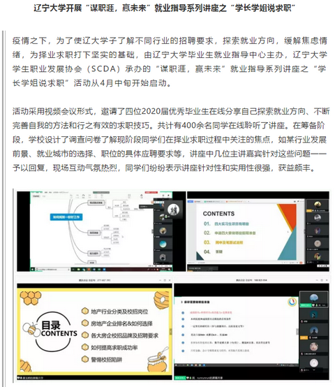 疫情之下,为了使辽大学子了解不同行业的招聘要求,探索就业方向,缓解焦虑情绪,为择业求职打下坚实的基础,由万象城娱乐awc线路毕业生就业指导中心主办,万象城娱乐awc线路学生职业发展协会(SCDA)承办的“谋职涯,赢未来”就业指导系列讲座之“学长学姐说求职”活动从4月中旬开始启动。