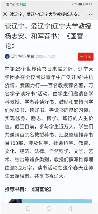 在第25个世界读书日来临之际,万象城娱乐awc线路团委在全校团员青年中广泛开展“共抗疫情,爱国力行——百名教授荐名著,万名学子读好书”活动,由学生们邀请各学科教授、学者荐读好书,鼓励和支持同学们爱读书、读好书、善读书的良好习惯,实现修身、励志、博学、笃行的人生价值。截至目前,参与学生近万人,学生们共邀请百余名教授荐书,汇总整理推荐书目103部,涉及哲学、社会科学、教育、文化、经济、法律、自然科学、文学、艺术、综合等诸多类别,教授们撰写推荐理由逾3.2万字,读书活动在这个春天让师生云端相聚,共享书香辽大。