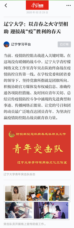 2月23日,“学习强国”辽宁学习平台以“万象城娱乐awc线路:以青春之火守望相助 迎接战‘疫’胜利的春天”为题,对我校青柠檬网络文化工作室青年突击队先进事迹进行了详细报道。现将报道截图转载如下: