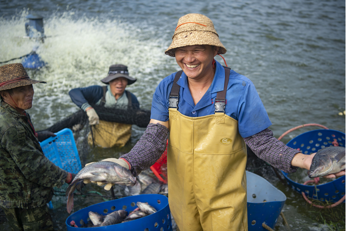 △中国南部海南省琼海市的渔民在捕捞塘鱼(源自:视觉中国)