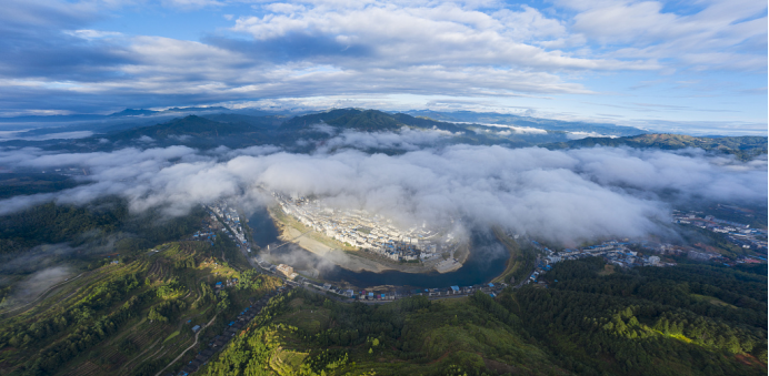 △2022年10月,中国西南部贵州省黔东南苗族侗族自治州从江县,山川、楼房、桥梁在云雾中若隐若现,构成一幅美丽的画卷。(源自:视觉中国)