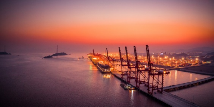 △中国东部,霞光中的宁波舟山港。2021年,宁波舟山港完成年货物吞吐量12亿吨,连续13年位居全球第一。(源自:视觉中国)
