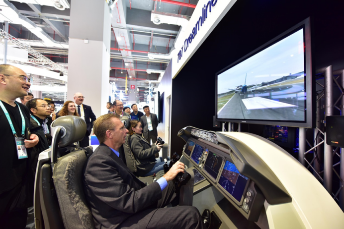 △2018年,首届中国国际进口博览会在上海举行,参观者在体验客机模拟起降设备。中国国际进口博览会至今已经举办四届,持续吸引全球目光。(源自:IC图库)