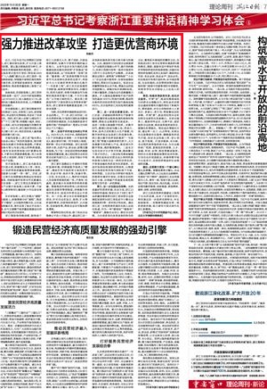 近日,习近平总书记考察浙江时指出,浙江要在深化改革、扩大开放上续写新篇。要以重点领域改革为牵引,全面推进各领域体制机制创新。浙江一直是改革开放先行省份,特别是2003年“八八战略”提出以后,浙江坚持一张蓝图绘到底,持续提升体制机制优势和环境优势,在贯彻新发展理念、构建新发展格局、推动高质量发展上取得了长足进步。