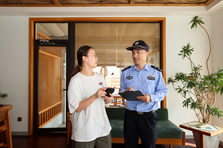 10月16日,舟山市公安局普陀山分局朱家尖派出所社区民警正在辖区民宿推广指导民宿业务“掌上办”。拍友 邹训永 摄