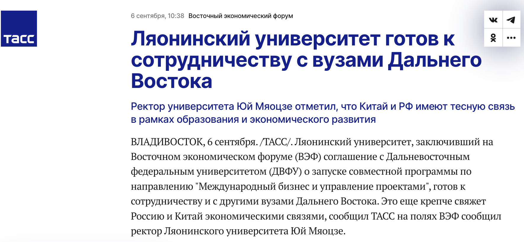 ВЛАДИВОСТОК, 6 сентября. /ТАСС/. Ляонинский университет, заключивший на Восточном экономическом форуме (ВЭФ) соглашение с Дальневосточным федеральным университетом (ДВФУ) о запуске совместной программы по направлению "Международный бизнес и управление проектами", готов к сотрудничеству и с другими вузами Дальнего Востока. Это еще крепче свяжет Россию и Китай экономическими связями, сообщил ТАСС на полях ВЭФ сообщил ректор Ляонинского университета Юй Мяоцзе.