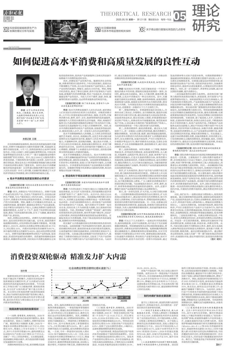 李政:今年的《政府工作报告》提出大力提振消费、提高投资效益,全方位扩大国内需求,同时强调推动更多资金资源“投资于人”、服务于民生。此后中办、国办又出台了《提振消费专项行动方案》。我国提振消费的潜力和空间巨大,而消费又是我国超大规模市场这一优势的来源,也必将进一步成为我国独特竞争力、进而促进产业结构转型升级和新质生产力发展。提升消费水平可谓牵一发而动全身,因而应该上升为国家重大战略,加以系统研究和有效推进。当前,美国挑起“关税战”“贸易战”,破坏国际经贸规则和多边贸易体制,使世界充满不确定性,因此扩大国内需求,特别是消费需求就显得更加必要和紧迫。实施促进高水平消费战略,有助于推动我国经济高质量发展,抵御和对冲各种风险挑战。