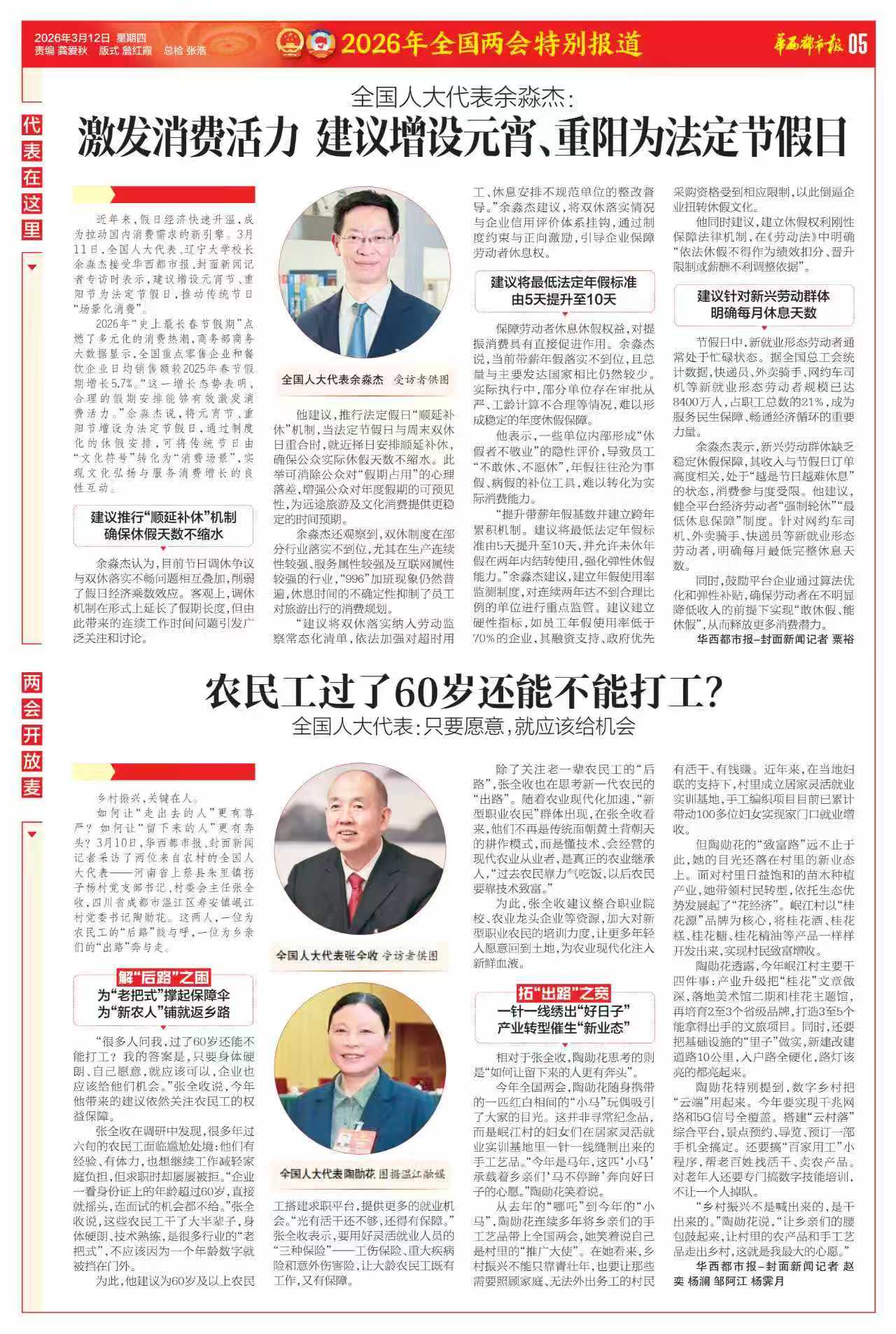 华西都市报|全国人大代表余淼杰:激发消费活力 建议增设元宵、重阳为法定节假日