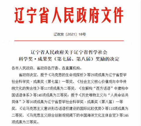 近日,辽宁省人民政府发布第七届、第八届辽宁省哲学社会科学奖成果奖(省政府奖)奖励决定。辽宁省哲学社会科学奖成果奖(省政府奖)经资格审查、初评、复评、终评、拟获奖公示、颁布决定,第七届获奖成果共291项。其中,一等奖29项、二等奖117项、三等奖145项;第八届获奖成果共294项。其中,一等奖30项、二等奖118项、三等奖146项。