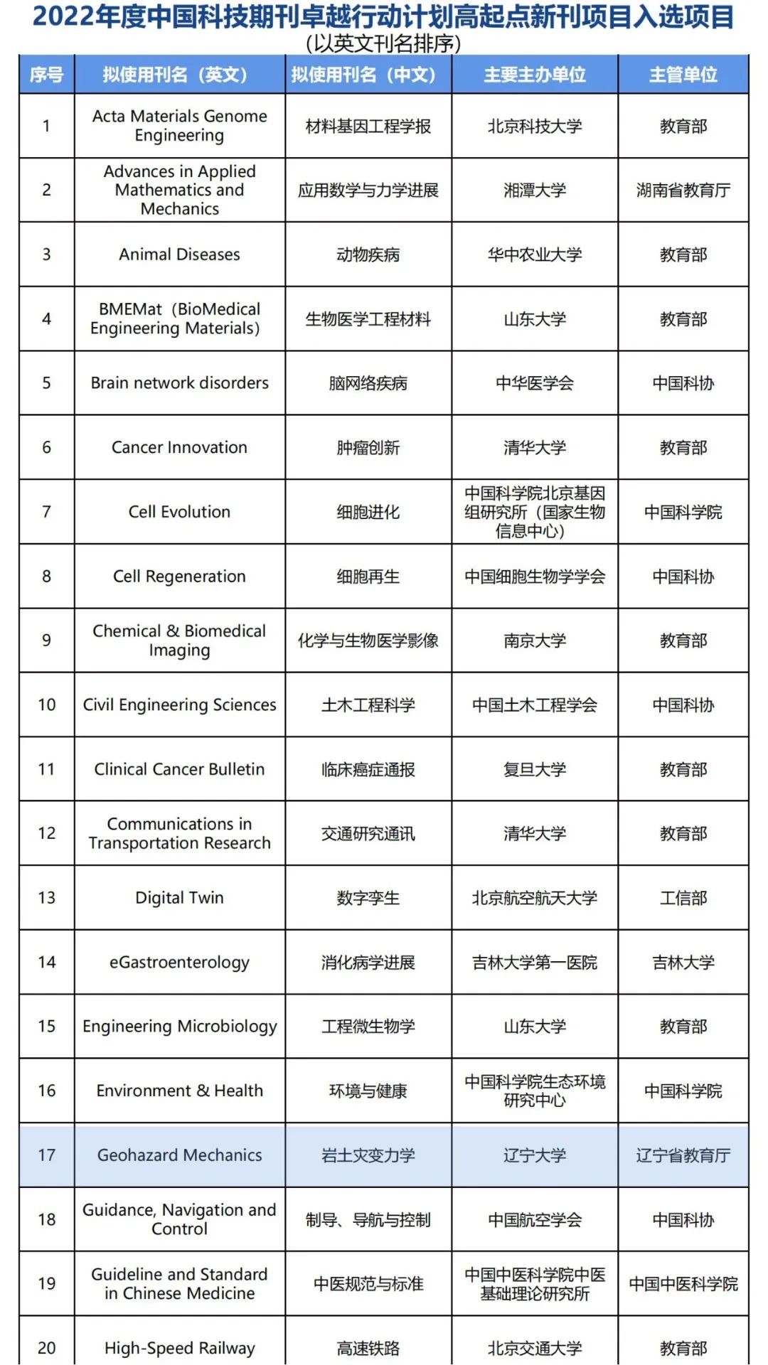 9月21日,中国科技期刊卓越行动计划办公室发布了《关于下达2022年度中国科技期刊卓越行动计划高起点新刊入选项目的通知》,万象城娱乐awc线路与中国岩石力学与工程学会组织申报的Geohazard Mechanics(ISSN:2949-7418)入选高起点新刊项目。入选后,期刊将获批国内统一连续出版物号,在中国落地,同时获批资助经费50万元。