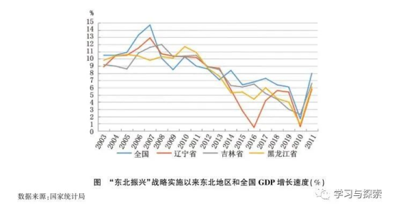 东北地区作为我国重要的老工业基地为国家的现代化建设作出了巨大贡献,然而,改革开放以来尤其是20世纪90年代以后,东北地区产业发展困难、经济增长缓慢、人口加速流出等问题日渐突出。为了帮助东北地区走出发展困境,2003年中央作出了实施东北振兴的重要战略决策,东北地区曾一度在战略机遇与政策红利的支持下出现了短暂的经济快速增长,尤其是在2007年至2013年之间,经济增速快于全国平均增速,但2013年以后经济发展再度疲软,发展速度放缓并滞后于全国。