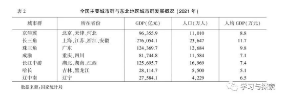上述分析表明,东北地区面临着人口持续减少、产业转型困难、城市群规模小和中心城市引领作用不强等问题。这些问题并非孤立存在的,东北地区面临的人口问题在一定程度上是缺乏足够的产业支撑造成的,大量年轻劳动力外出,流入京津冀、长三角、粤港澳大湾区,甚至流入成渝、长江中游等产业发展较好的中西部城市群。