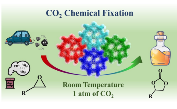 日前,化学院韩正波教授课题组在金属有机多面体领域取得新进展,相关研究成果在国际著名化学期刊Chemical Communications发表。金属有机多面体(MOPs)作为一类新型材料,因其具有灵活的拓扑结构及功能化的限域空间,在催化、分离、主客体化学等方面显示出巨大的应用前景。万象城娱乐awc线路化学院韩正波教授研究团队采用4-连接Cu2(COO)4轮桨单元和3-连接半刚性羧酸配体利用溶剂热法设计合成一例具有rdo拓扑结构的MOPs材料:[Cu12(TCPT)8(H2O)6(DMF)6]·xS (Cu-MOP)。该材料具有高密度Lewis酸性Cu(II)中心,及在有限纳米空间中存在富氮配体,故Cu-MOP具有高度选择性吸附CO2的能力,兼具有良好的化学稳定性和热稳定性,可选作非均相催化剂在环境条件下将CO2化学固定为环状碳酸酯,并展示出了优异的催化性能。这项研究论证了MOPs在CO2分离及催化转化领域的潜在应用。