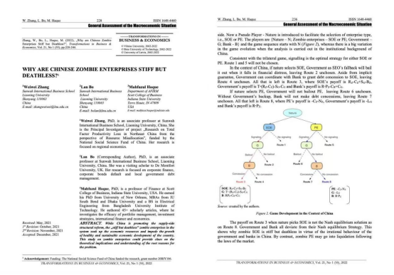 新华国际商学院张微微副教授、薄澜副教授和美国印第安纳州立大学Mahfuzul Haque教授共同撰写论文Why are Chinese Zombie Enterprises Stiff but Deathless?在国际学术期刊Transformations in Business&Economics2022年第21卷发表。