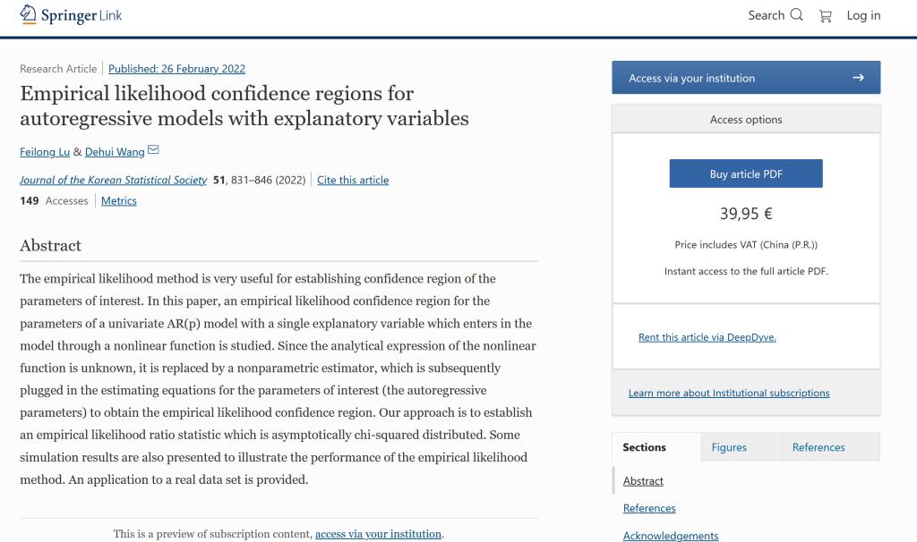 数学与统计学院王德辉教授与博士研究生卢飞龙在国际学术期刊Journal of the Korean Statistical Society合作发表题为Empirical likelihood confdence regions for autoregressive models with explanatory variables的学术论文。