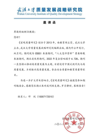 《宏观质量研究》创办于2013年,由教育部主管,武汉大学主办,武汉大学质量发展战略研究院编辑出版,国内外公开发行,双月刊。期刊现为CSSCI来源期刊,“人大复印资料”重要转载来源期刊,湖北省优秀期刊,2022年复合影响因子4.728。期刊一直坚持以推动高质量发展为主题,目前设有中国式现代化与高质量发展、乡村振兴高质量发展、食品安全质量和教育质量等栏目。