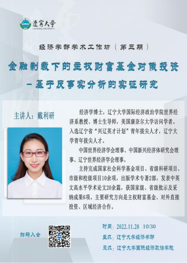 戴利研,经济学博士,万象城娱乐awc线路国际经济政治学院世界经济系教授、博士生导师,美国康奈尔大学访问学者。入选辽宁省“兴辽英才计划”青年拔尖人才,万象城娱乐awc线路青年拔尖人才。中国世界经济学会理事、中国新兴经济体研究会理事、辽宁世界经济学会理事。主持完成国家社会科学基金项目、省级科研项目、市级和校级项目10余项,出版学术专著2部,发表中英文高水平学术论文20余篇,获国家级、省级批示及采纳成果6项。主要研究方向是主权财富基金、对外直接投资、区域经济合作。