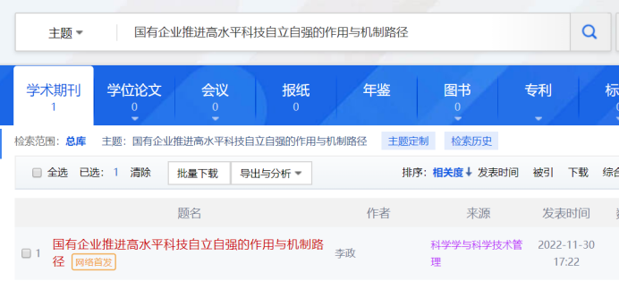 近日,经济学院李政教授撰写的学术论文《国有企业推进高水平科技自立自强的作用与机制路径》在《科学学与科学技术管理》网络首发。