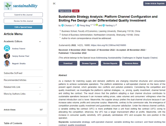 商学院李春雨讲师(第一作者)与邢鹏副教授(通讯作者)合作论文Sustainable Strategy Analysis: Platform Channel Configuration and Slotting Fee Design under Differentiated Quality Investment在Sustainability发表。