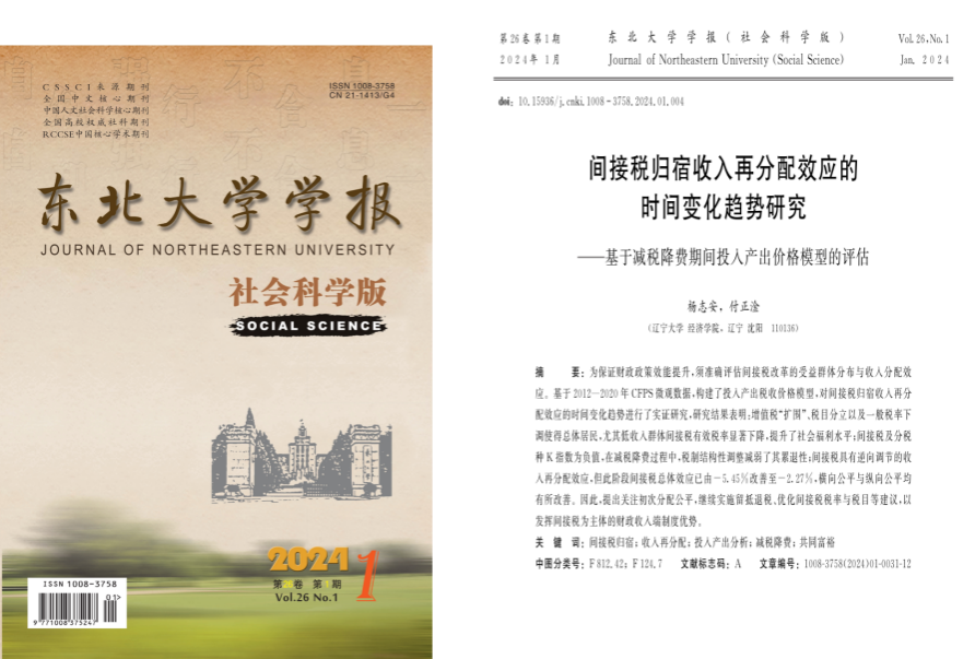 日前,经济学院杨志安教授与其指导的博士生付正淦在《东北大学学报(社会科学版)》2024年第1期合作发表论文《间接税归宿收入再分配效应的时间变化趋势研究——基于减税降费期间投入产出价格模型的评估》。