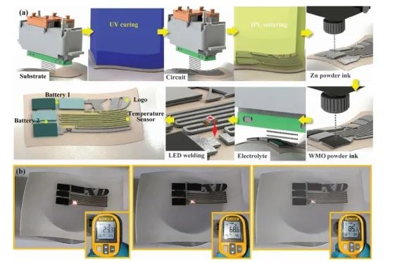 相比于传统的平面电路,曲面共形电路在空间优化、便携性、集成能力、响应速度和可靠性等方面有着明显的优势。这些优势是在科学探索中设计和实施各种电子设备和系统的重要技术手段。为此,研究团队利用增材制造技术,基于全自研的五轴联动曲面多材料打印设备,在非可展开曲面上制造出具有掺钨二氧化锰阴极的水性锌离子电池。五轴联动运动系统有助于缩短紧凑型电池的离子传输路径,并确保精确、高效地成形非可展开曲面。之后,将打印电池与纳米银蛇形电阻温度传感器集成,并利用强脉冲烧结技术实现集成功能电路的快速烧结。电路中集成的发光二极管可通过LED亮度的变化测量温度。载体表面高度吻合的储能模块具有体积小、空间利用率高的优点。在曲面上一体化成形功能电路的能力为储能技术的创新提供了新的途径,为实现共形器件的一体化快速制造提供了解决方案。