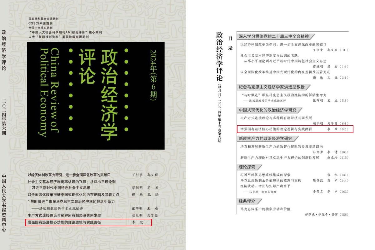 近日,经济学院李政教授在《政治经济学评论》2024年第6期上发表封面文章《增强国有经济核心功能的理论逻辑与实践路径》。