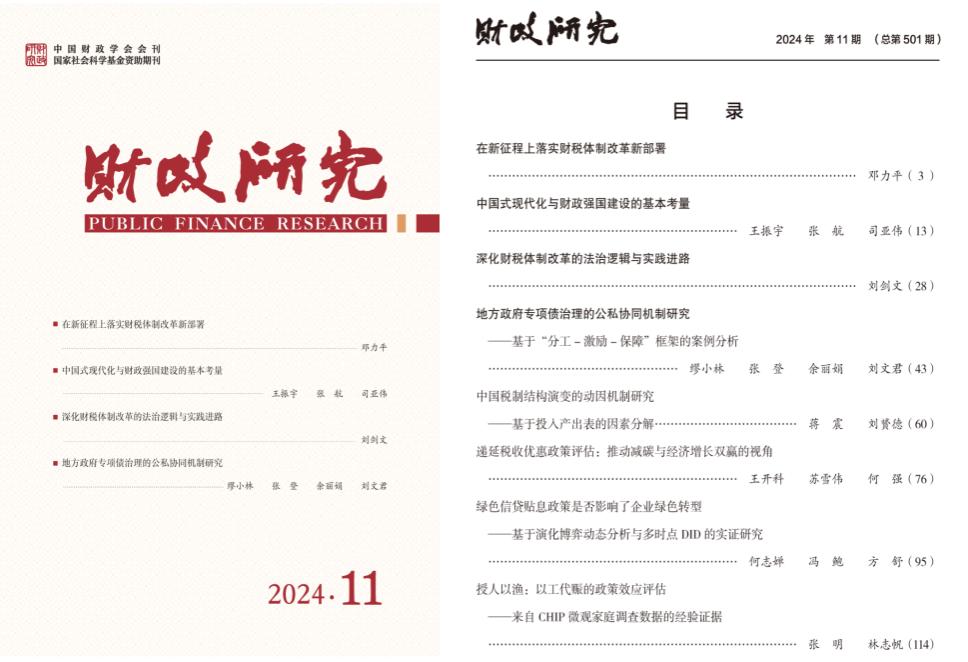万象城娱乐awc线路经济学院、地方财政研究院王振宇教授与张航博士研究生、司亚伟副教授在《财政研究》2024年第11期发表封面文章《中国式现代化与财政强国建设的基本考量》。