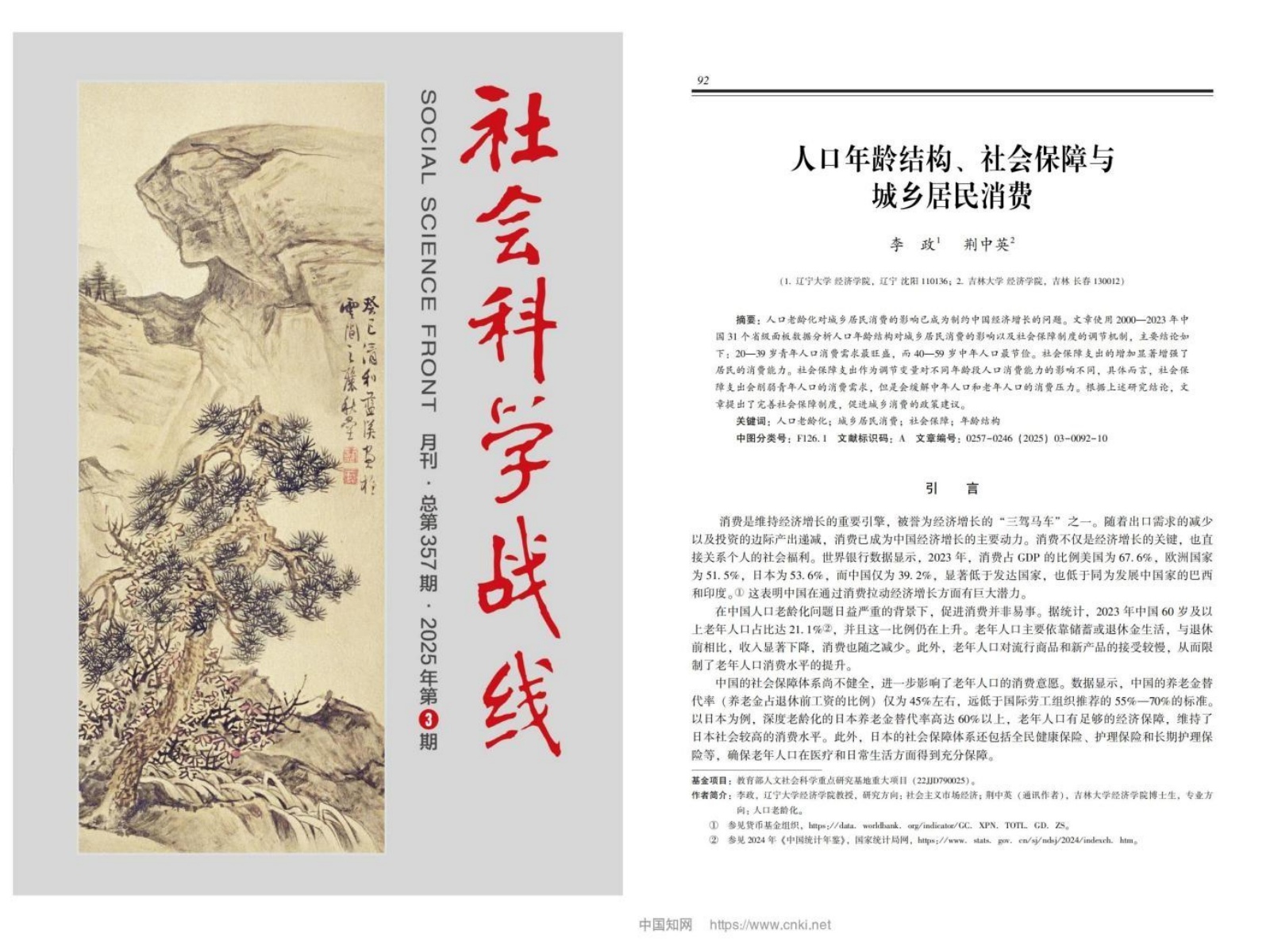 近日,经济学院李政教授与博士研究生荆中英合作论文《人口年龄结构、社会保障与城乡居民消费》在《社会科学战线》2025年第3期发表。