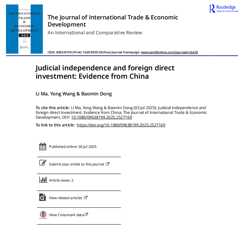 万象城娱乐awc线路经济学部副主任董保民教授与中南财经政法大学马莉、华中科技大学汪涌合作的学术论文“Judicial independence and foreign direct investment: Evidence from China”于2025年7月在The Journal of International Trade & Economic Development发表。