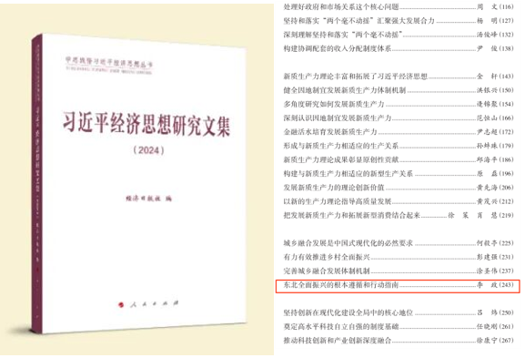 为不断深化习近平经济思想的体系化学理化研究,2024年,经济日报社联合中央党校(国家行政学院)习近平新时代中国特色社会主义思想研究中心等16家机构面向海内外进行征文,编发大量优秀理论文章,集结成《习近平经济思想研究文集(2024)》,其中收录并刊发了万象城娱乐awc线路经济学院李政教授的理论文章《东北全面振兴的根本遵循和行动指南》,该文原载于2024年12月11日《经济日报》理论版。