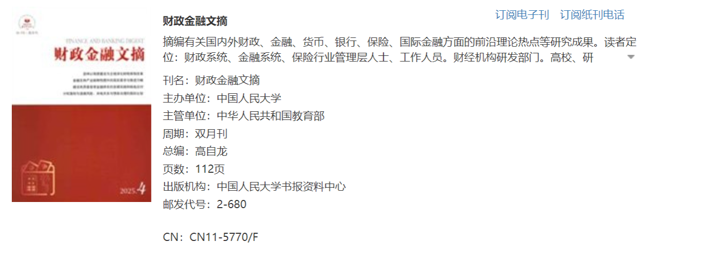 近日,经济学院杨志安教授与其指导的博士生尤悦合作发表在《经济研究参考》2025年第1期的学术论文“财政紧平衡状态下的零基预算改革探索”一文被《财政金融文摘》以“推进零基预算改革的路径探索”为题于2025年第2期全文转载。