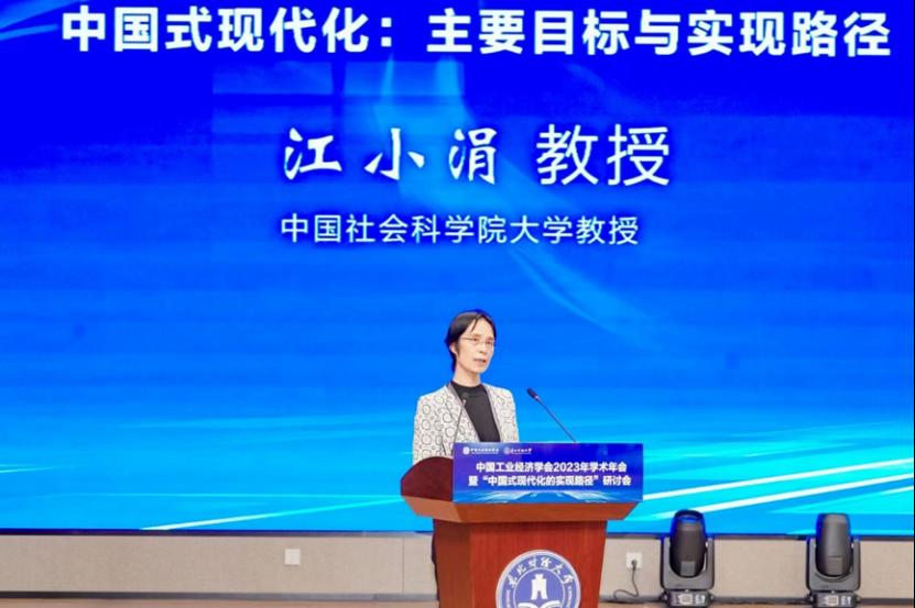 主旨演讲第一环节由首都经济贸易大学党委书记王文举教授主持。中国社会科学院大学江小涓教授、东北财经大学党委书记肖兴志教授分别作了主旨演讲。