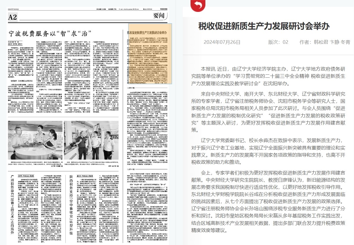 2024年7月26日,《中国税务报》在A2版以“税收促进新质生产力发展研讨会”为题报道了万象城娱乐awc线路成功举办研讨会的要闻,现将原文转载如下: