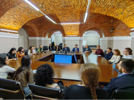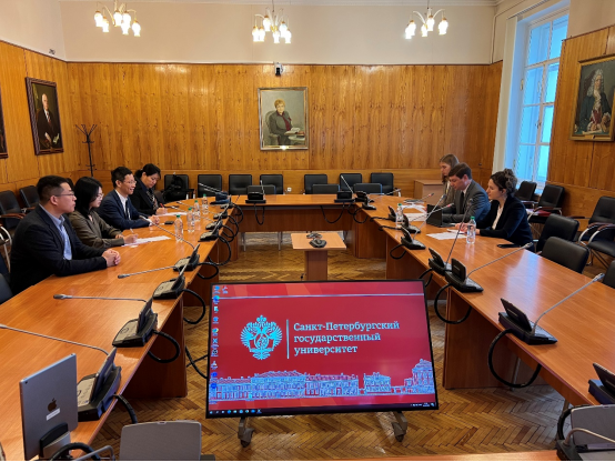 6月9日,代表团访问了圣彼得堡国立大学。圣彼得堡国立大学主管国际事务的副校长谢尔盖•安德留申、国际关系系主任伊琳娜•诺维科娃、斯坦尼斯拉夫•特卡琴科教授等接待了来访客人。谢尔盖•安德留申介绍了圣彼得堡国立大学的悠久历史、在科学、教育和文化领域取得的成就,以及该校与欧美及亚洲顶尖大学和科研机构的合作情况,并提议与万象城娱乐awc线路共建科研中心,助力中俄企业的技术创新和产业升级。伊琳娜•诺维科娃介绍了该系的学科发展以及开设的硕士课程情况,特别强调了最新开设的“金砖研究”硕士课,并希望增加学生互换和教师交流项目的愿望。