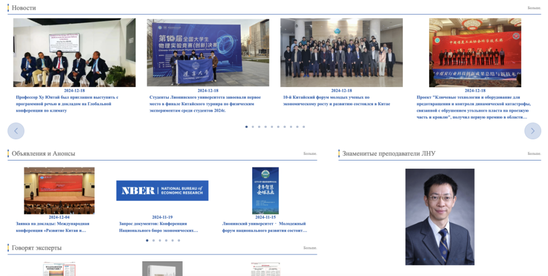 在校领导的高度重视和学校信息化中心的通力协作下,经过国际交流处的精心筹备,俄文网站现已正式开通。网站设有学校概况(Об университете)、教学(Образование)、科研(Наука)、合作交流(Международное сотрудничество)等栏目,全方位展现学校在教育教学、学术研究、国际合作等方面的突出成果。此外,网站首页还设置了热点新闻(Новости)、通知公告(Объявления и Анонсы)、专家说(Эксперты говорят)、校科研期刊(Журналы ЛНУ)等模块,为国内外用户提供丰富的信息资源。用户可以通过域名https://ruweb.lnu.edu.cn/或辽大中英文官方网站首页上的Русский链接访问俄文网站。