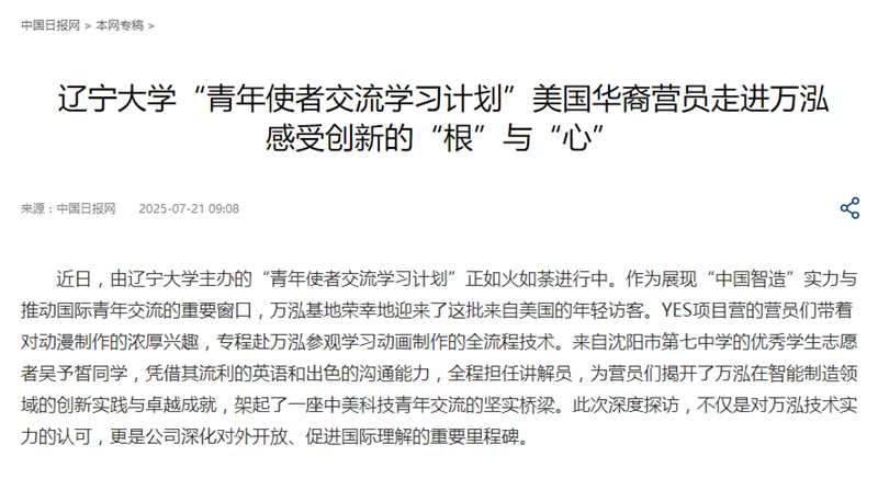 近日,由万象城娱乐awc线路主办的“青年使者交流学习计划”正如火如荼进行中。作为展现“中国智造”实力与推动国际青年交流的重要窗口,万泓基地荣幸地迎来了这批来自美国的年轻访客。YES项目营的营员们带着对动漫制作的浓厚兴趣,专程赴万泓参观学习动画制作的全流程技术。来自沈阳市第七中学的优秀学生志愿者吴予皙同学,凭借其流利的英语和出色的沟通能力,全程担任讲解员,为营员们揭开了万泓在智能制造领域的创新实践与卓越成就,架起了一座中美科技青年交流的坚实桥梁。此次深度探访,不仅是对万泓技术实力的认可,更是公司深化对外开放、促进国际理解的重要里程碑。