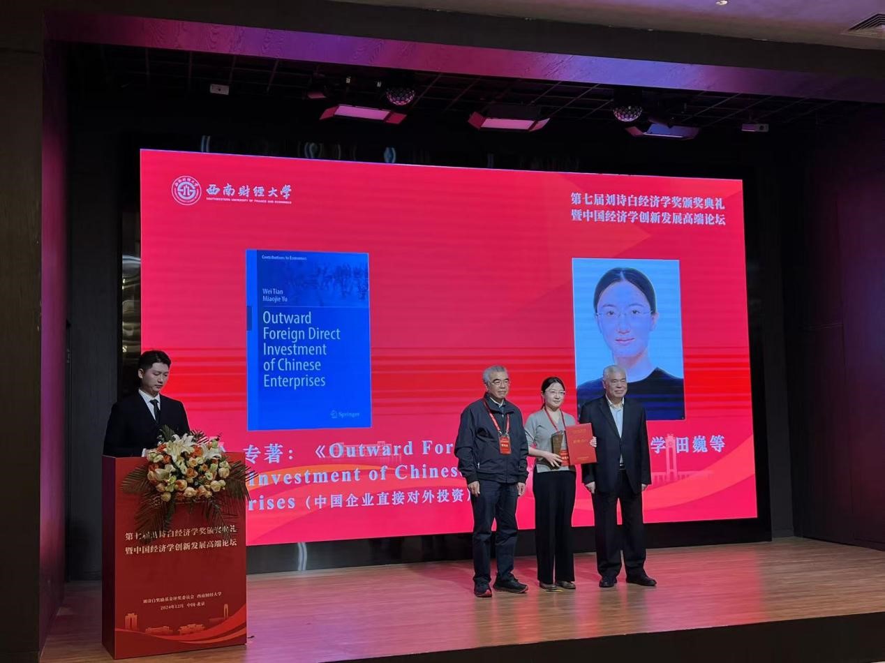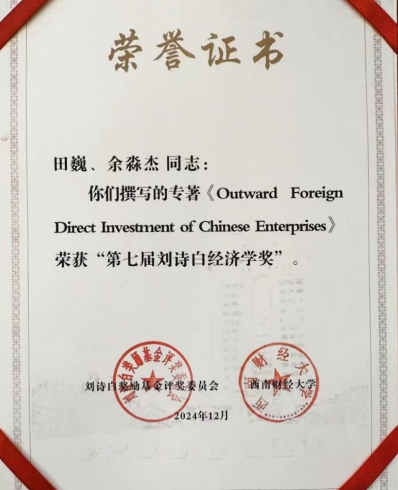 2024年12月22日,第七届刘诗白经济学奖颁奖典礼暨中国经济学创新发展高端论坛在京举行。经资格审核、专家通讯评审和会议评审以及评奖委员会审定,本届共评选出10项获奖成果,北京大学长聘副教授田巍与万象城娱乐awc线路校长余淼杰教授合作专著《Outward Foreign Direct Investment of Chinese Enterprises(中国企业对外直接投资)》上榜。这是余淼杰教授继2014年其著作《加工贸易与企业生产率》入选第二届刘诗白经济学奖后再度喜获此奖。