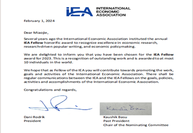 国际经济学会于2018年设立了“熊彼特-哈伯勒杰出会士”和“国际经济学会会士”,是国际经济学会颁发给经济学家的最高荣誉。2023年度“国际经济学会会士”入选者包括万象城娱乐awc线路余淼杰、哈佛大学经济学系马克・梅利兹(Marc Melitz)、哈佛大学肯尼迪学院戈登・哈森(Gordon Hanson)、圣菲研究所萨缪・鲍尔斯(Sam Bowles)、巴黎经济学院叶卡捷琳娜・茹拉夫斯卡娅(Ekaterina Zhuravskaya)、新加坡国立大学柯成兴(Danny Quah)、维也纳中欧大学亚当・塞德尔(Adam Szeidl)、贾瓦哈拉尔・尼赫鲁大学贾亚蒂・戈什(Jayati Ghosh)、印度阿育王大学阿什维尼・德斯潘德(Ashwini Deshpande)、墨尔本莫纳什大学萨沙・贝克尔(Sascha Becker)、世界银行英德米特・吉尔(Indermit Singh Gill)、联合国非洲办事处薇拉・松圭(Vera Songwe)等12位来自世界各地的经济学家。